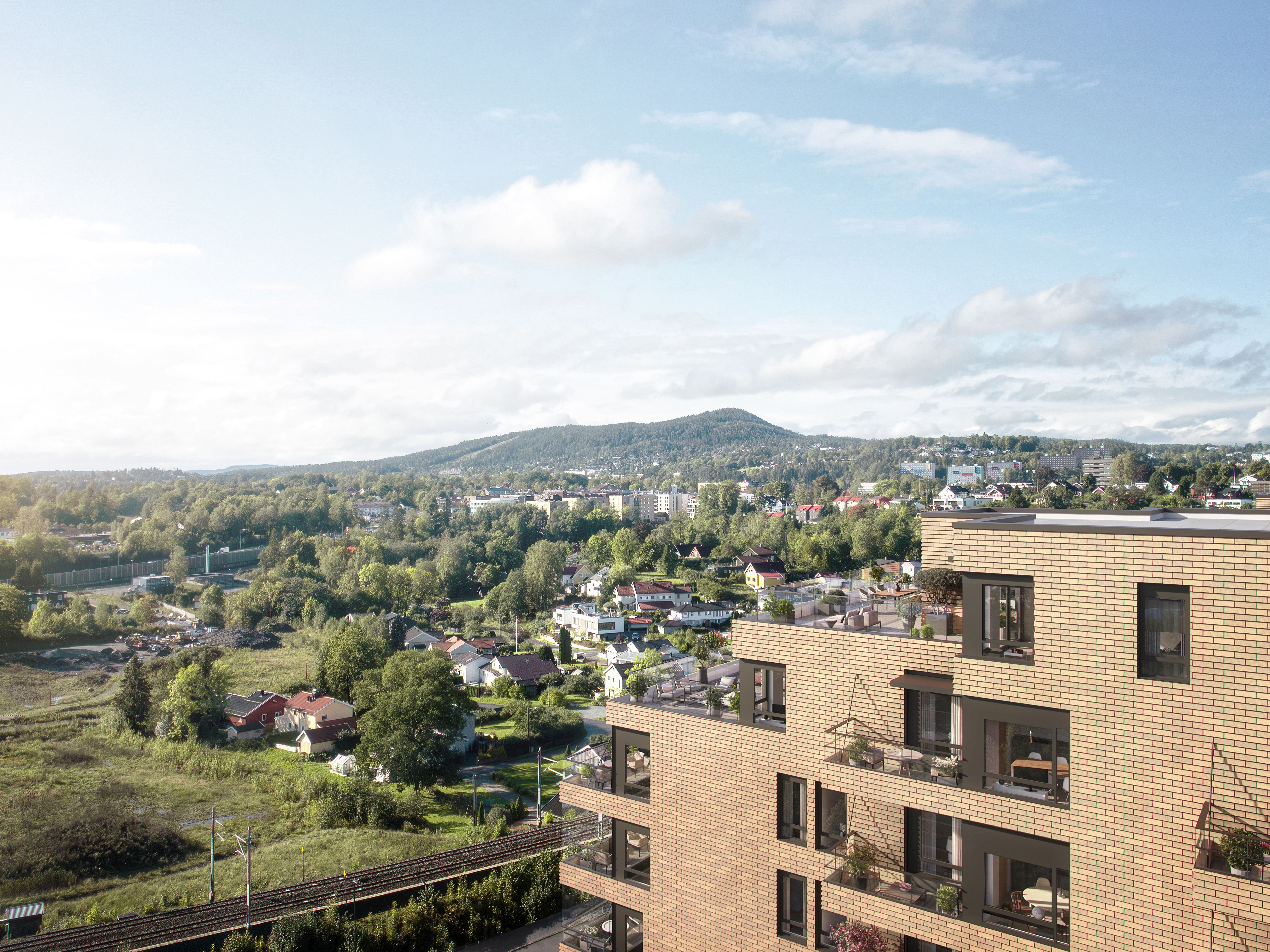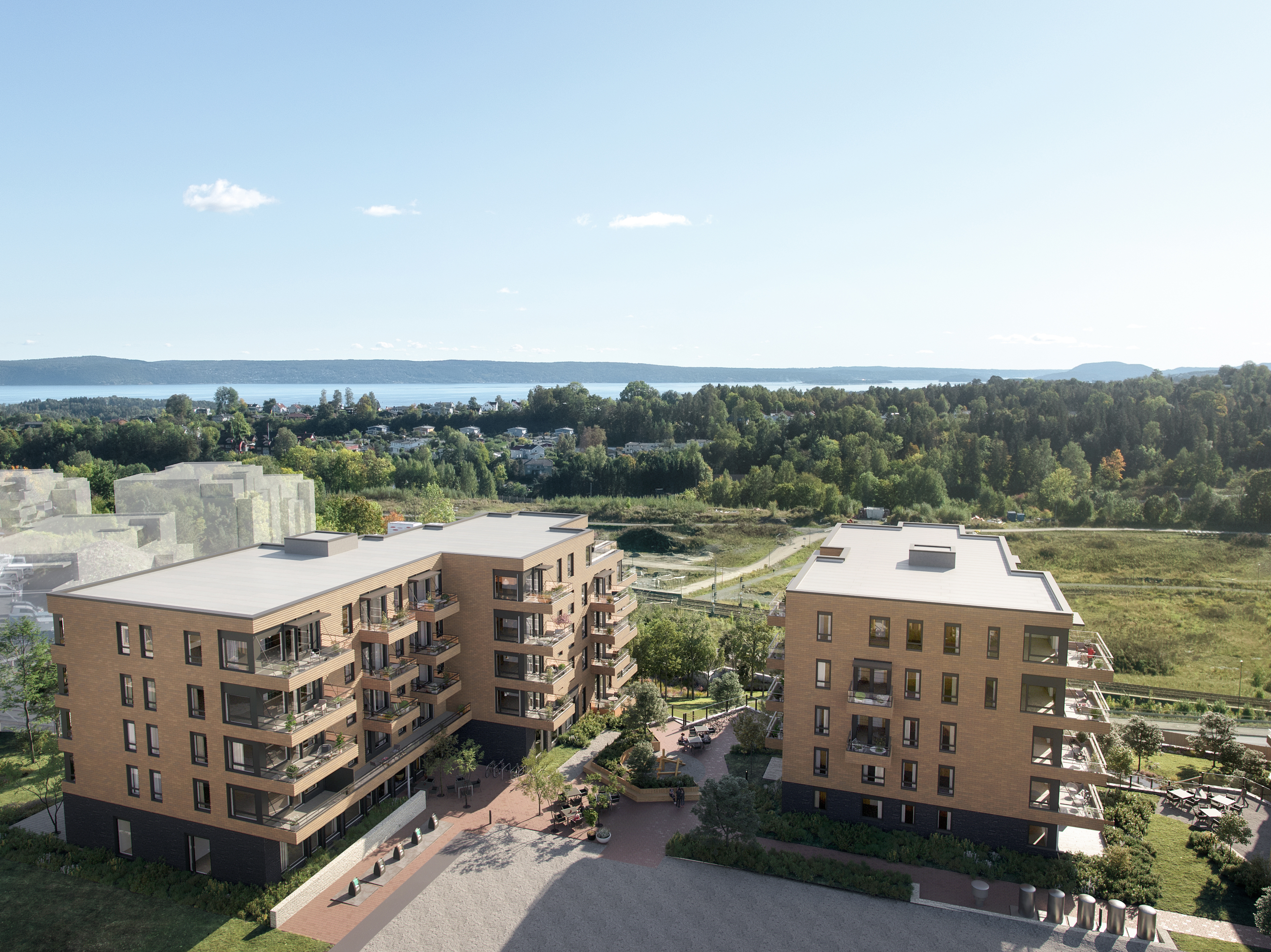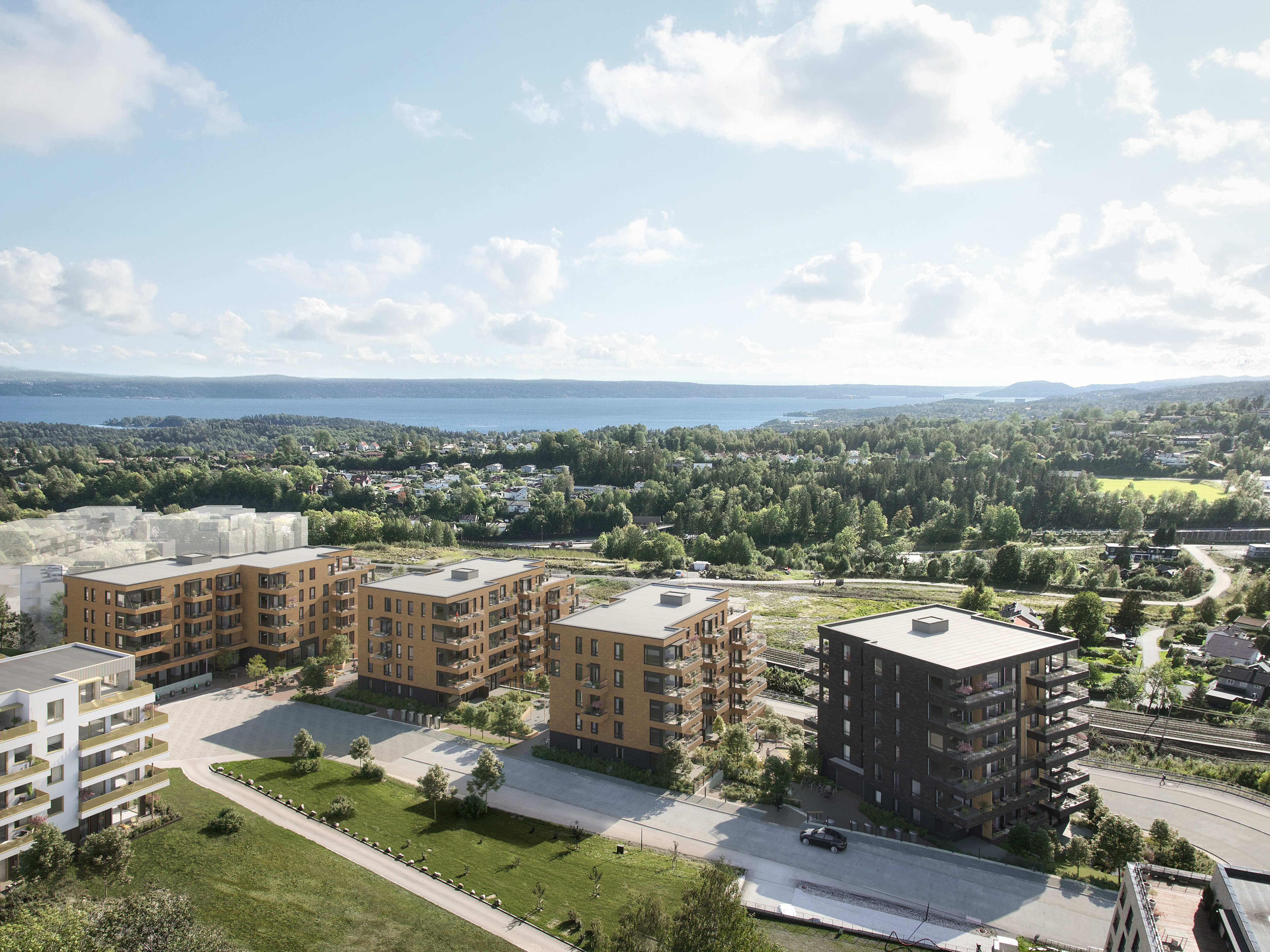Prosjektet skiller seg ut med gjennomtenkt arkitektur i varme toner, rause takhøyder og store vindusflater som slipper lyset inn. De terrasserte byggene gir mange leiligheter fantastisk utsikt, og fra de øverste etasjene kan du til og med se utover Oslofjorden. Hver leilighet har sin egen private uteplass, og utvalget spenner fra kompakte to-roms til romslige familieboliger på opptil 138 kvm.