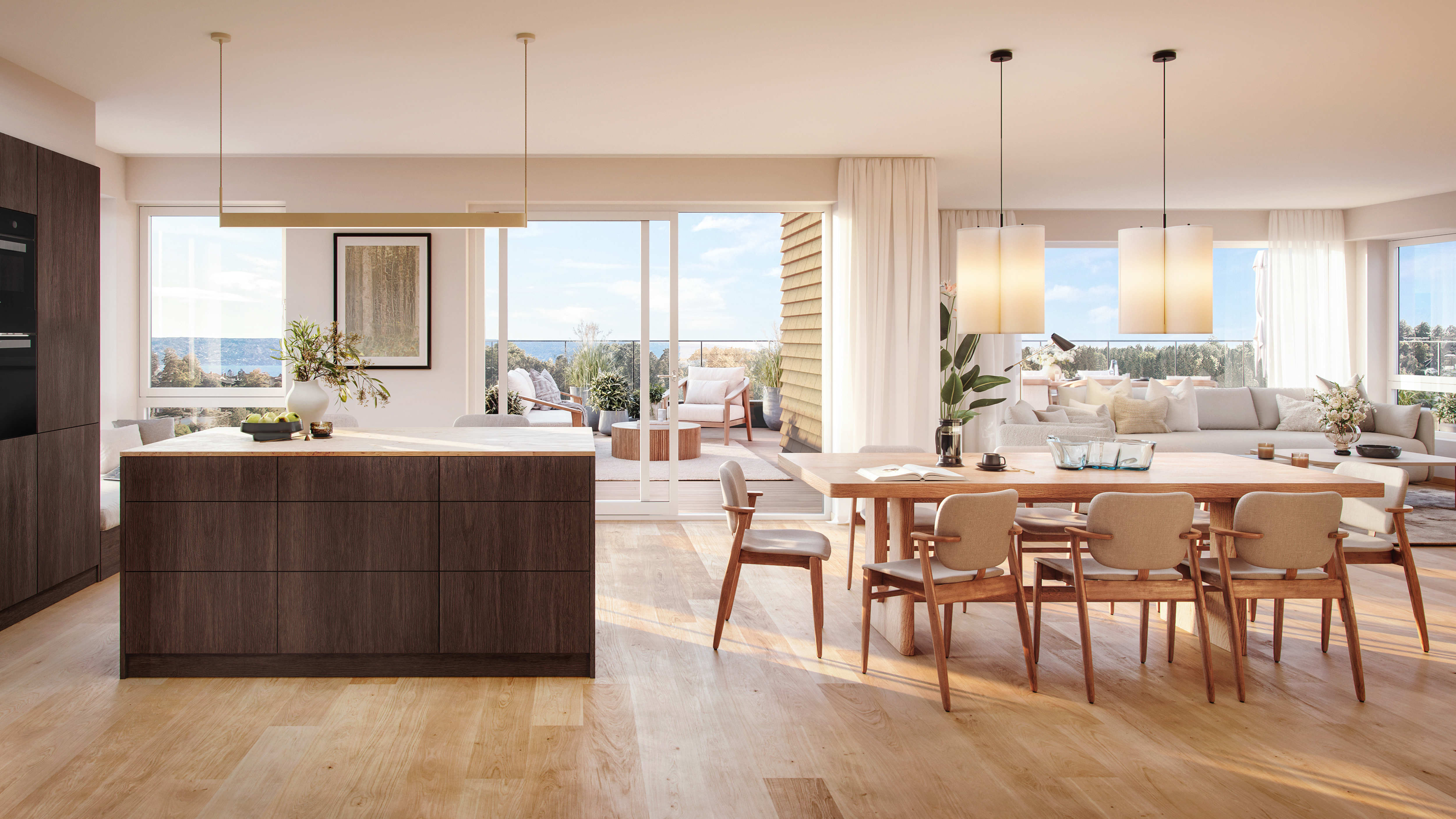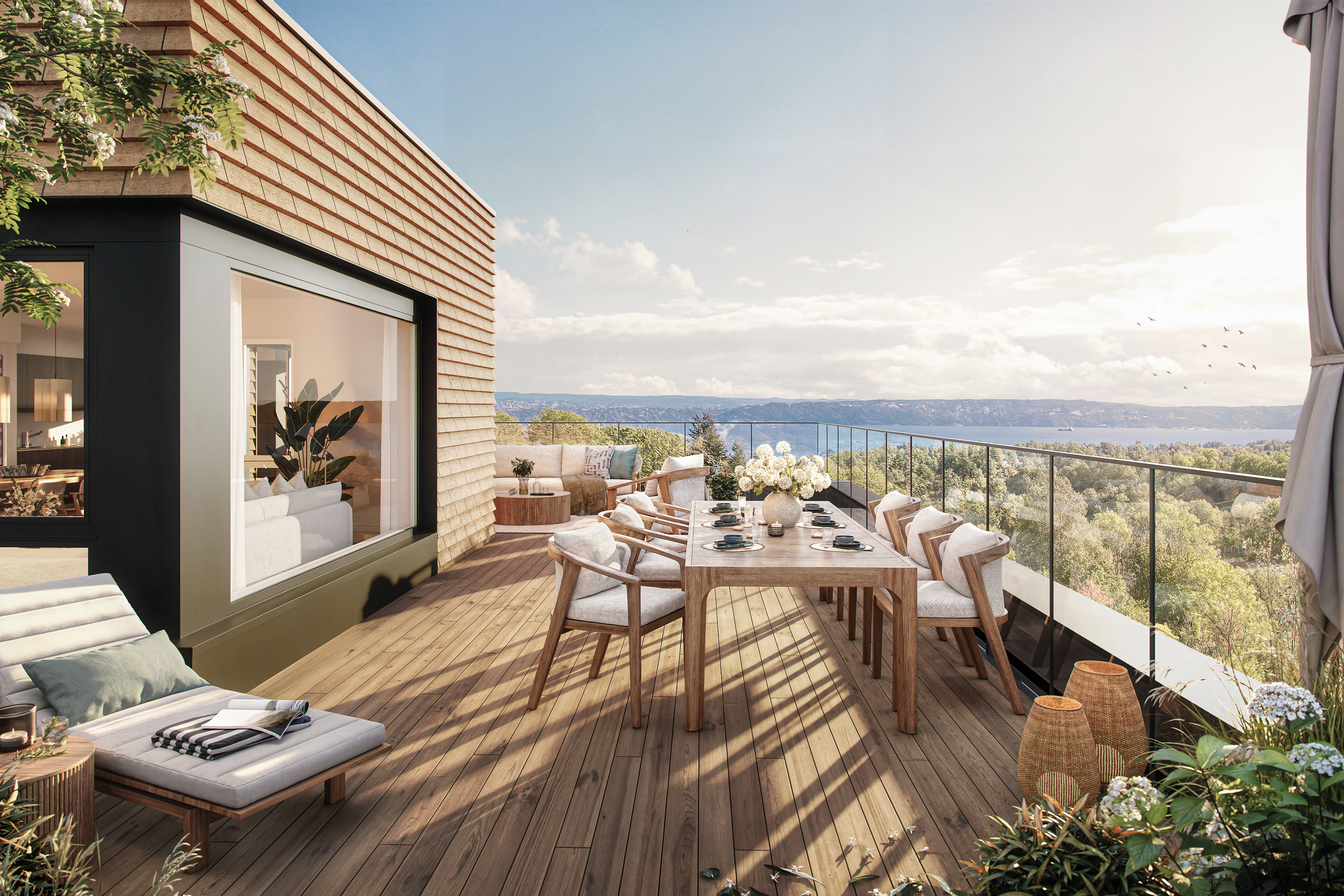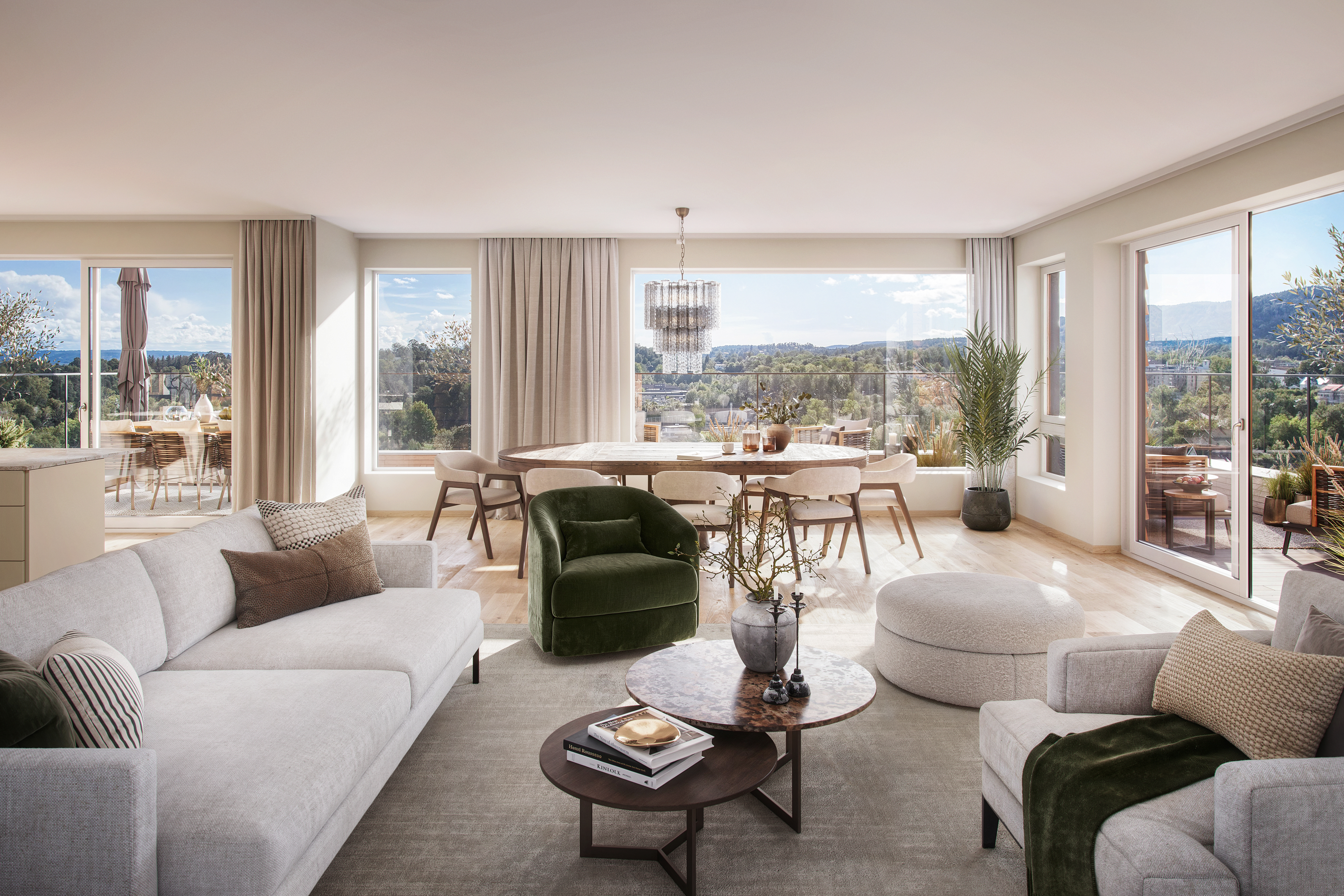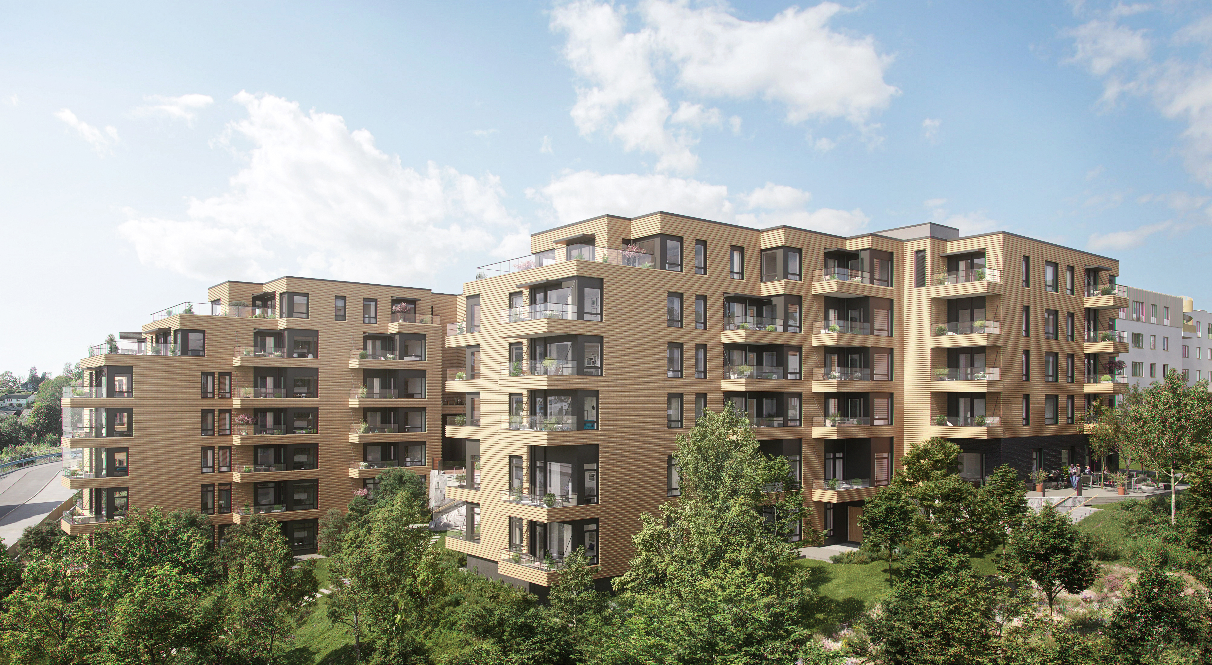 Prosjektet skiller seg ut med gjennomtenkt arkitektur i varme toner, rause takhøyder og store vindusflater som slipper lyset inn. De terrasserte byggene gir mange leiligheter fantastisk utsikt, og fra de øverste etasjene kan du til og med se utover Oslofjorden. Hver leilighet har sin egen private uteplass, og utvalget spenner fra kompakte to-roms til romslige familieboliger på opptil 138 kvm.