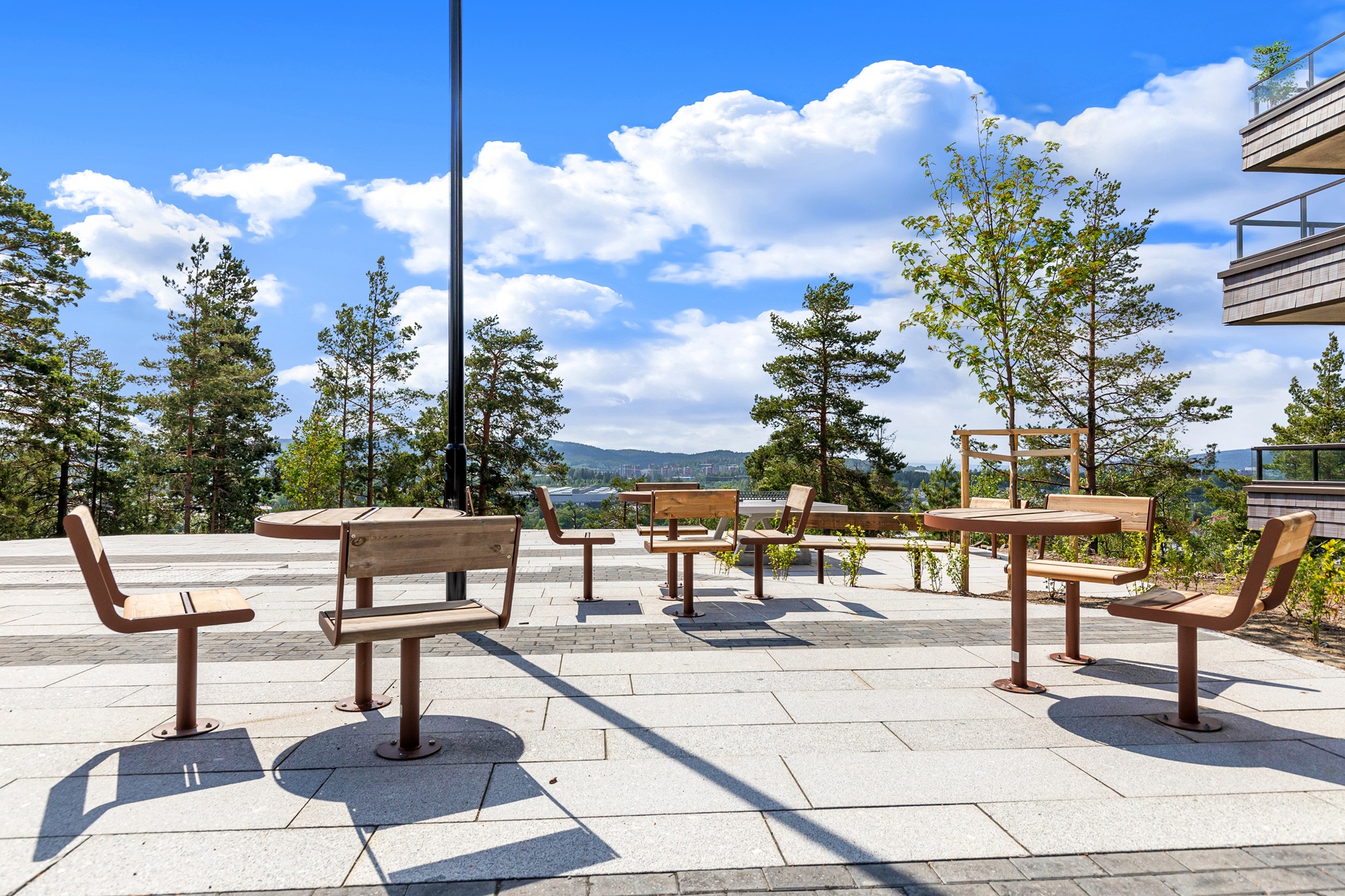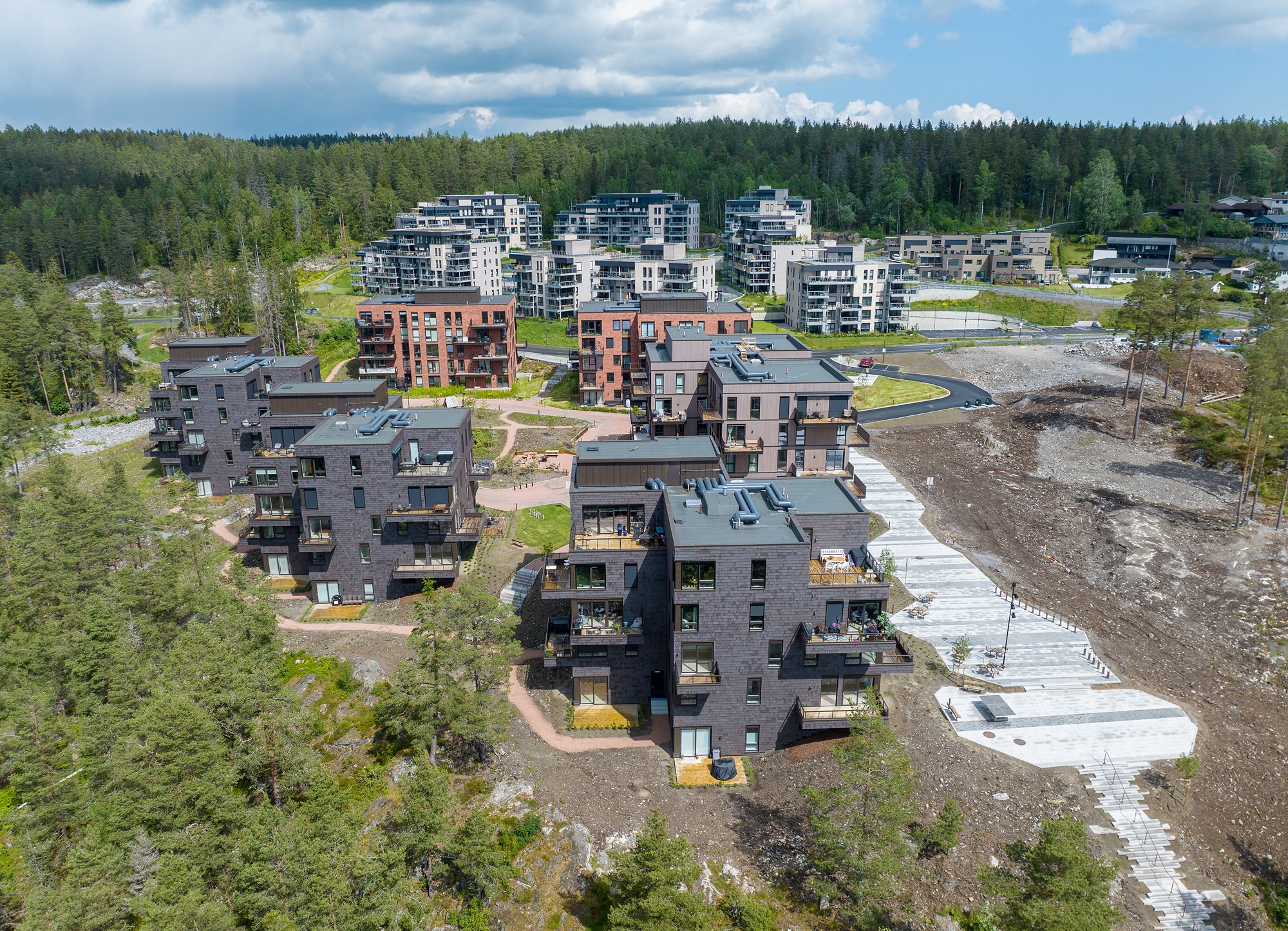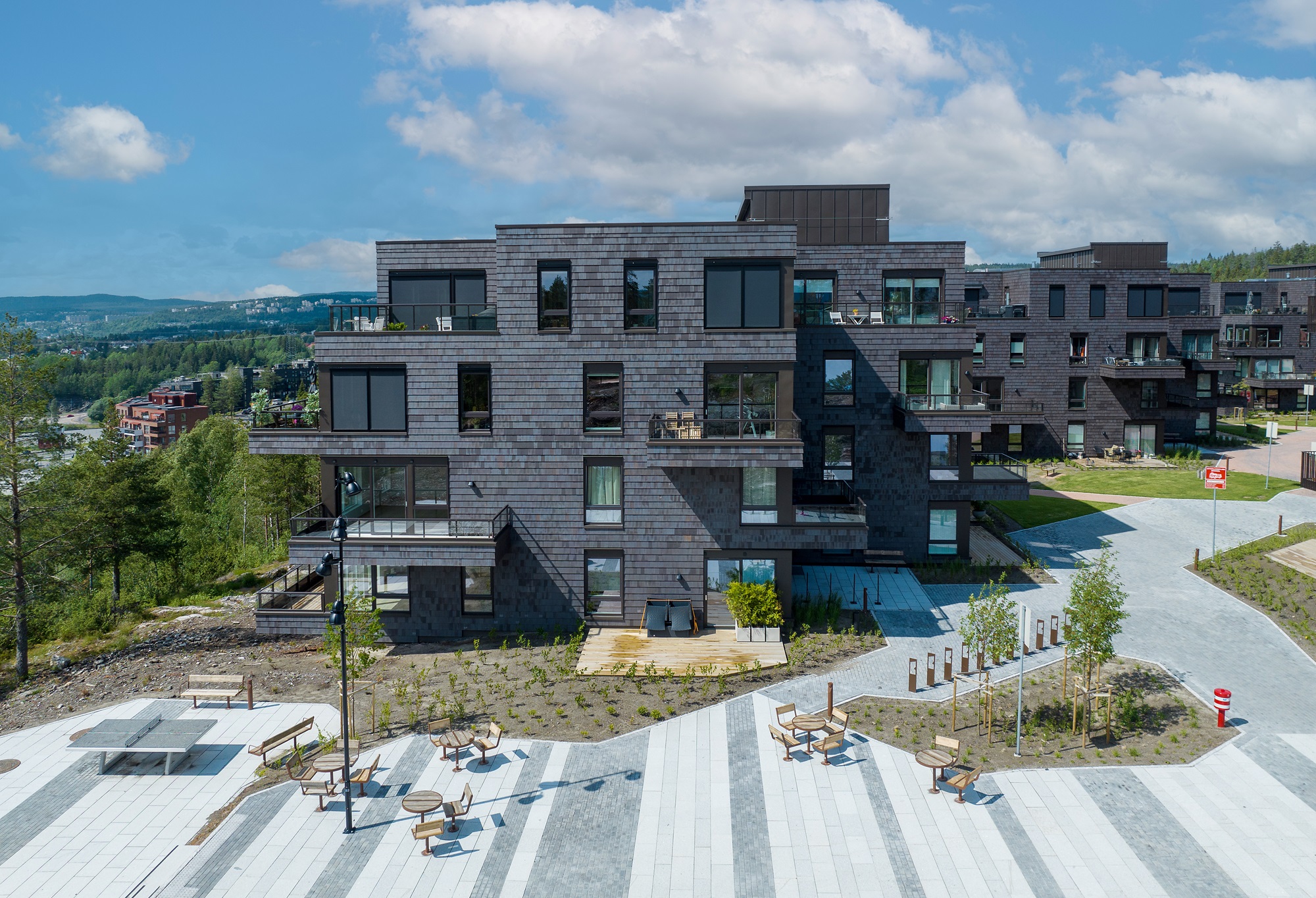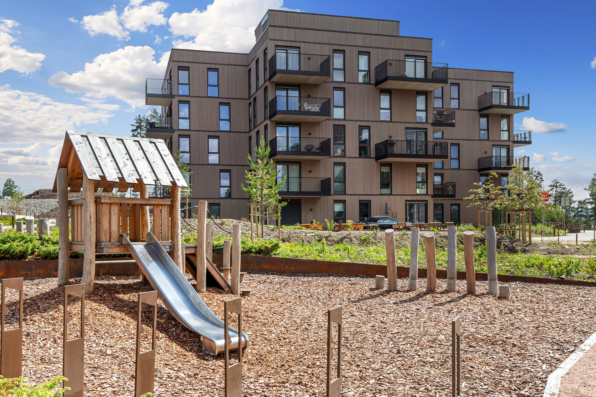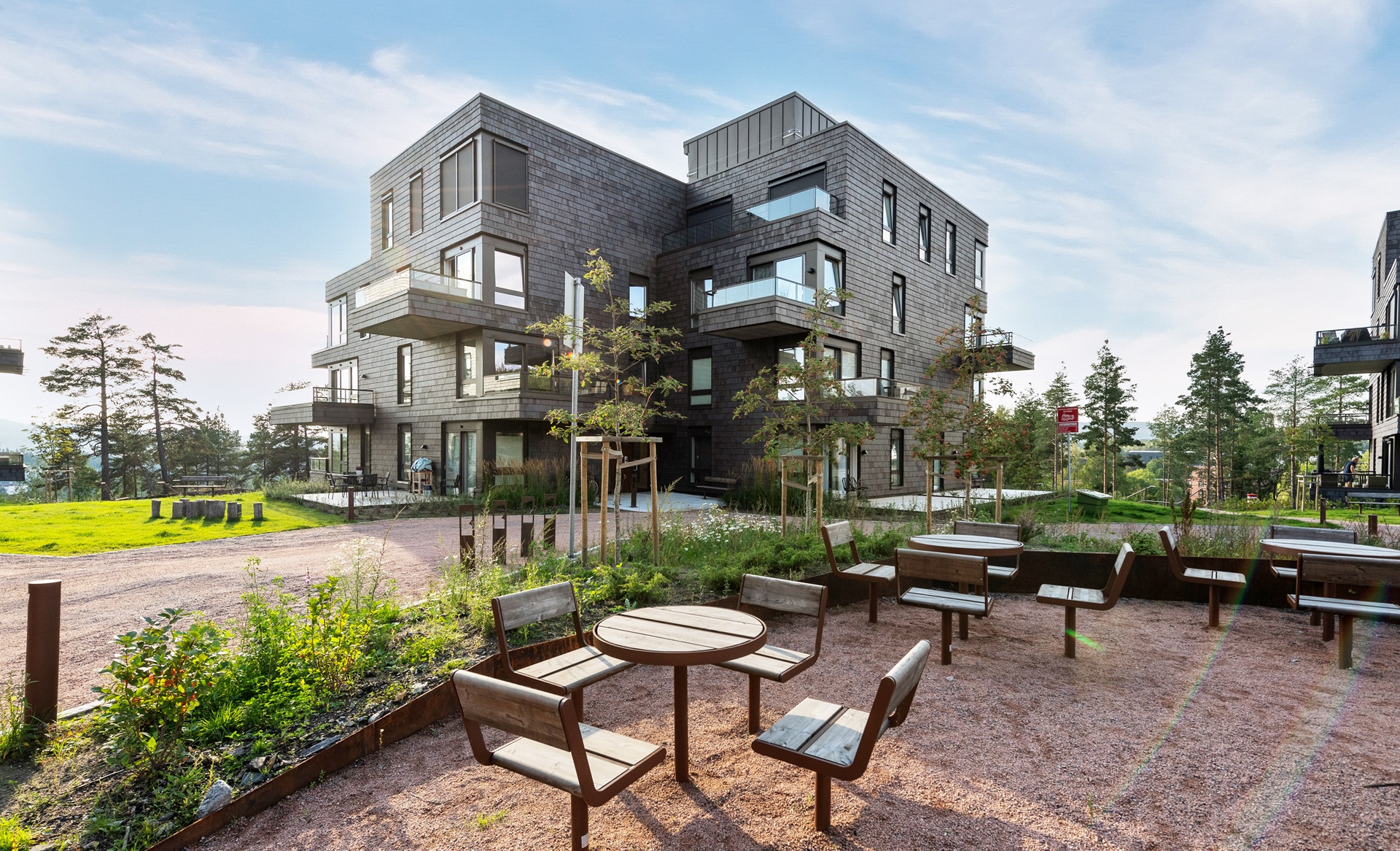 På Pallplassen kan du ta på deg turskoene eller skiene hjemme og gå rett ut i skogen. Rundt husene er det dessuten store uteområder hvor vi har hentet inn den naturlige vegetasjonen i området. Et flott trappeanlegg fører ned til en felles allmenning med festplass, torg og amfi. På lekeplassene har vi brukt naturens egne materialer i lekeapparatene.
