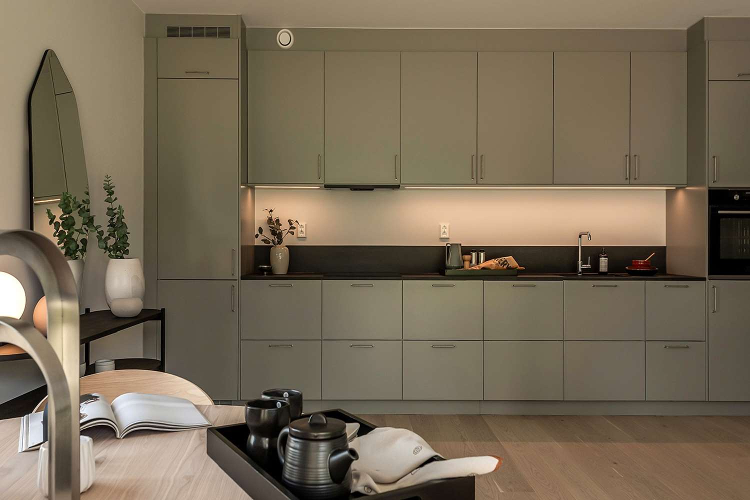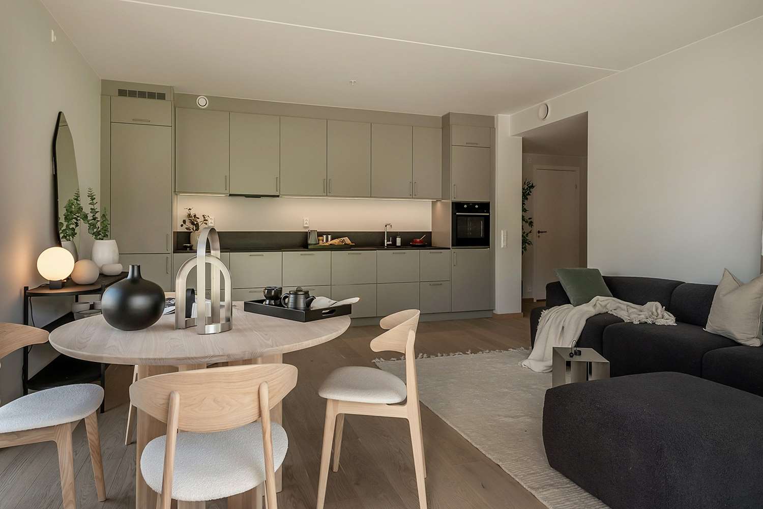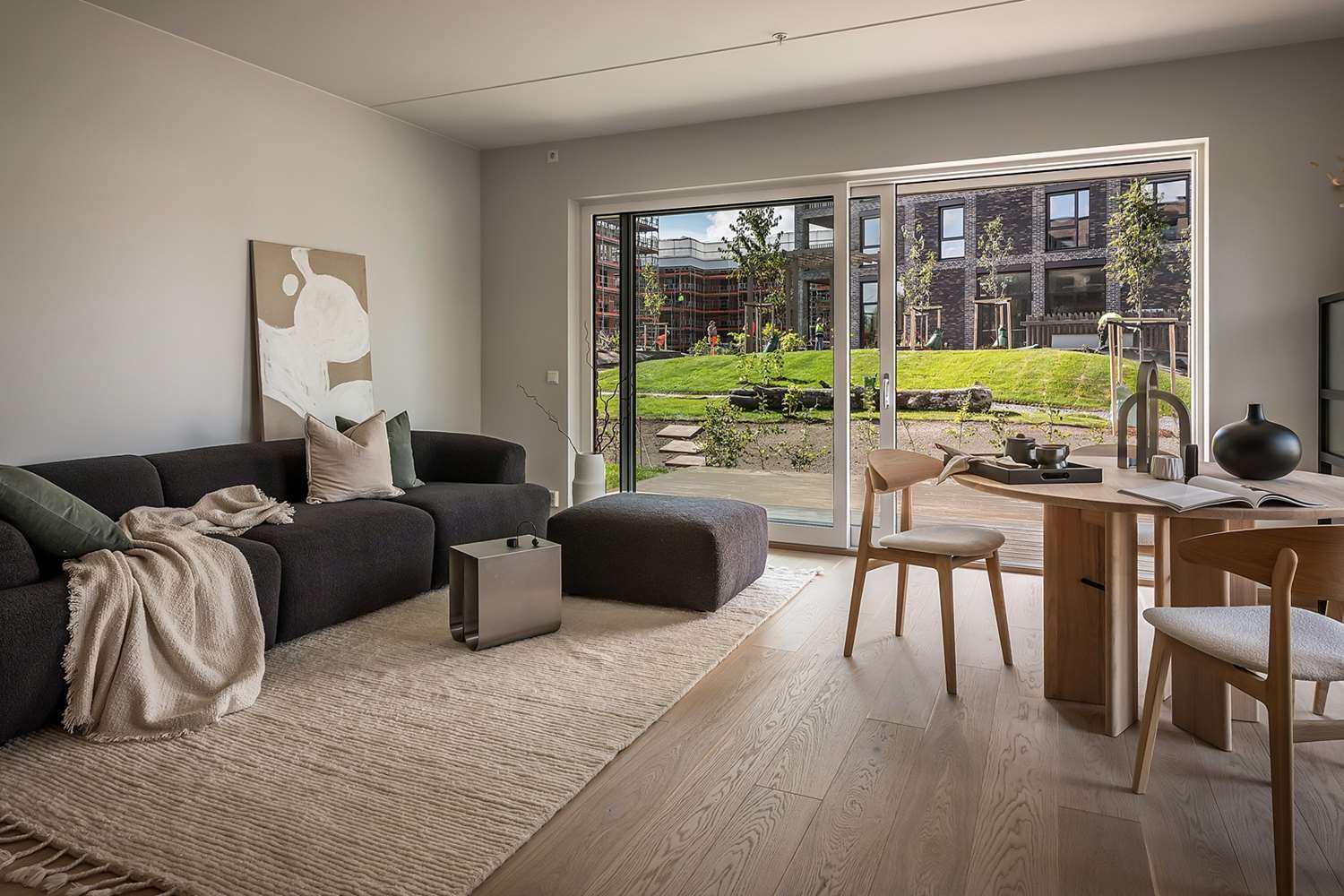 Alle leilighetene får 1-stavs parkett, og selvsagt egen uteplass i form av terrasse, balkong eller takterrasse. Noen av leilighetene får også privat hage i tilknytningen til terrasse. Boligene blir listefrie rundt vinduene, og du kan velge mellom 3 ulike kjøkkenmodeller/konsepter inkl. hvitevarer uten ekstra kostnad ved kjøp før tilvalgsfristen utløper.