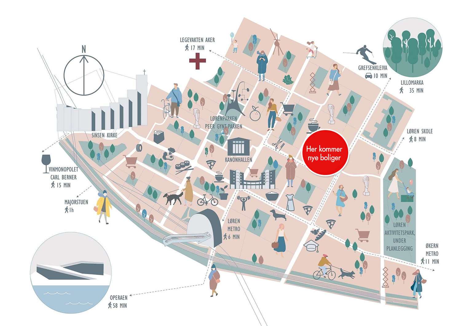 På Løren har du alt du trenger i umiddelbarhet nærhet. Det som tidligere var et industriområde og en militærleir, er nå totalt forvandlet til en helt ny bydel. Her er alt nøye planlagt for å gjøre livet så enkelt og komfortabelt som mulig for de som bor her. Skoler, barnehager og servicetilbud er i hyggelig gangavstand. Kort vei til to T-banestasjoner sørger for at du unngår kø og rush til og fra jobben. Butikker, kafeer og spisesteder gjør Løren til en egen småby du vil trives i og føle tilhørighet til.