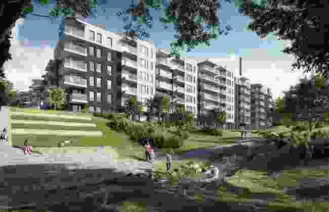 Tiedemannsfabrikken ligger innerst i blindvei, i nærheten av eksisterende og fremtidig parkdrag.