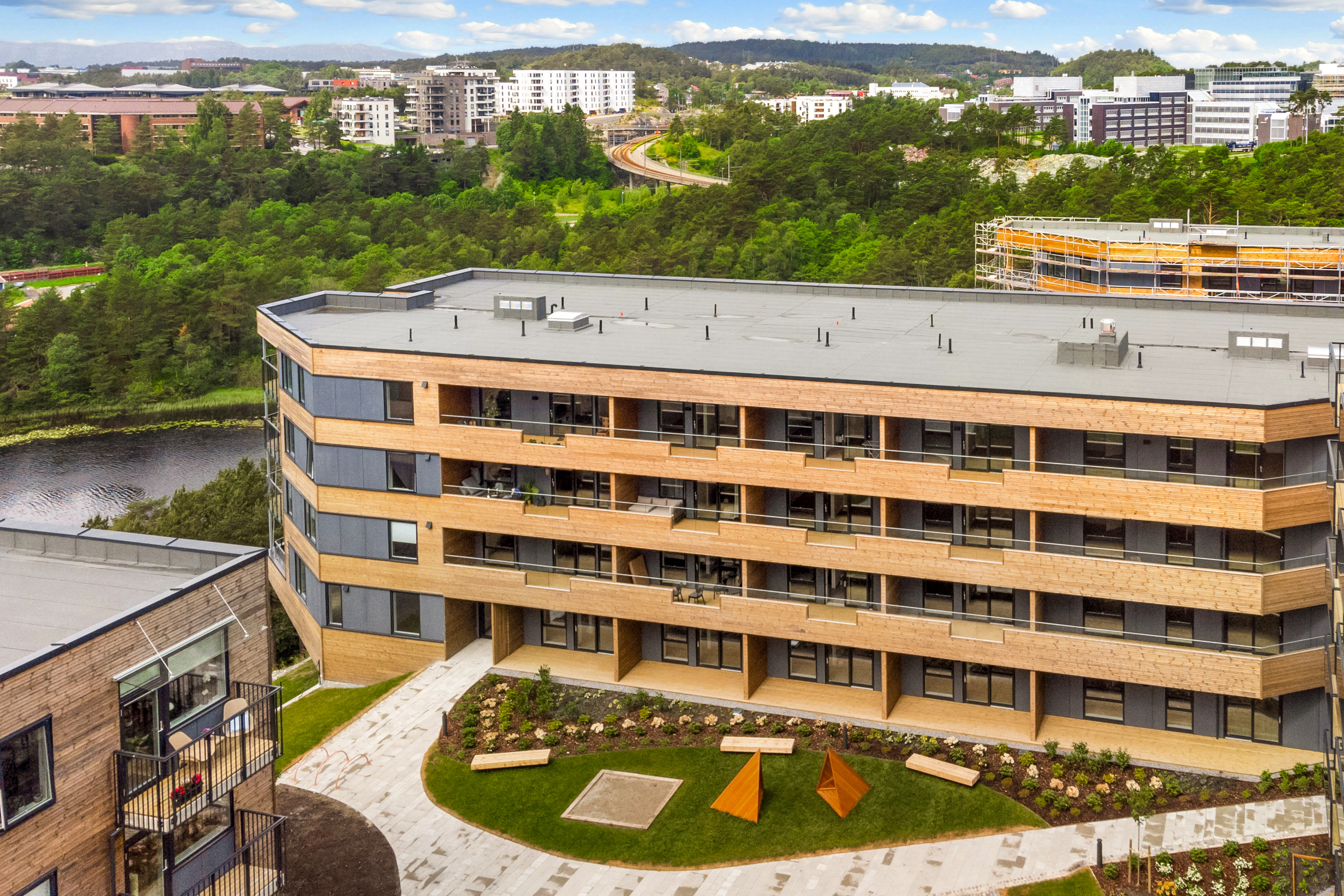Uteområdene er bilfrie og universelt utformede, med koller, vannspeil, lekeområder og beplantning. I tillegg ligger skogen og vannet helt nær. «Vi planlegger ikke bare for menneskene, men også for dyrene og fuglene som allerede bor her», sier landskapsarkitekt Grete Evenstad.