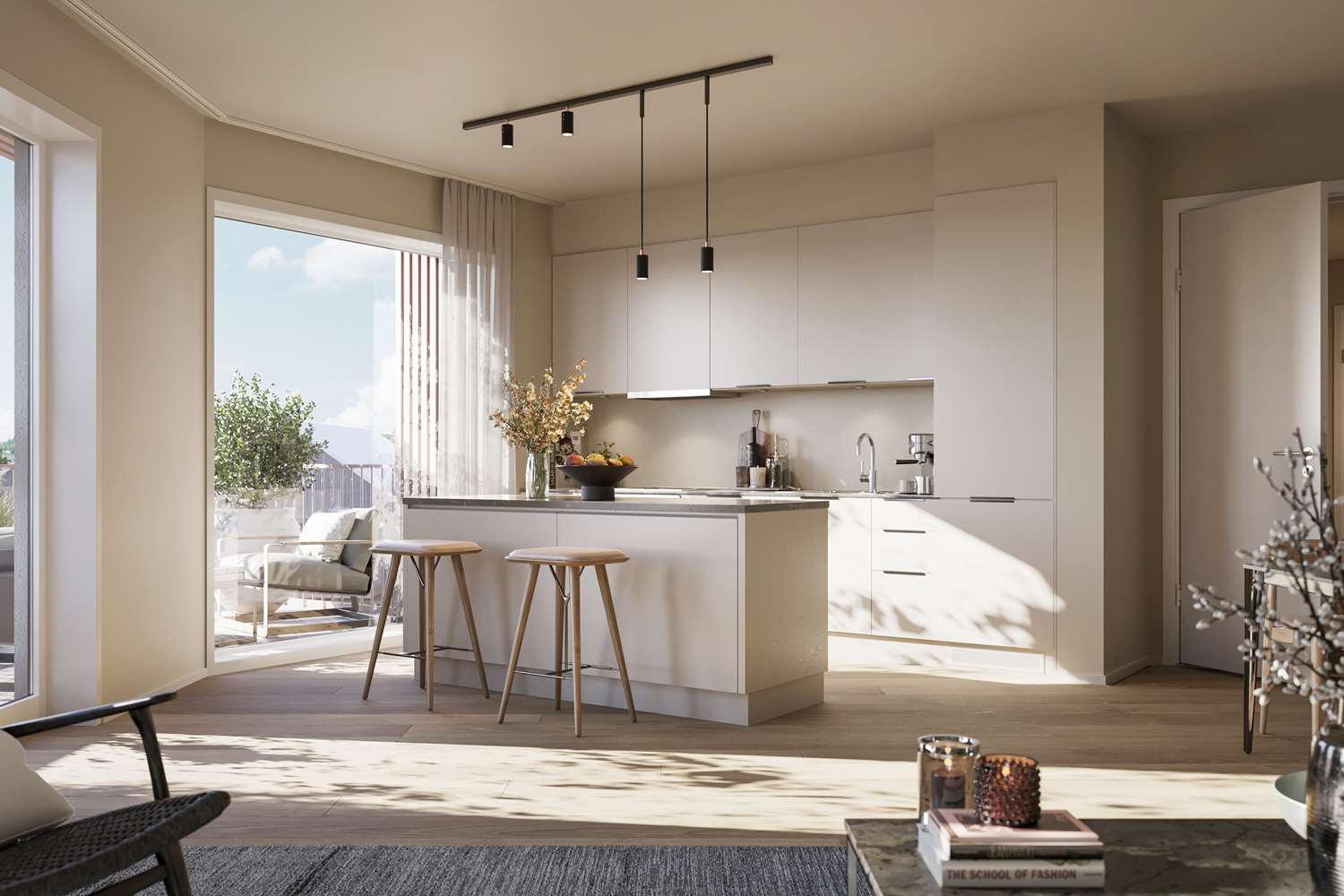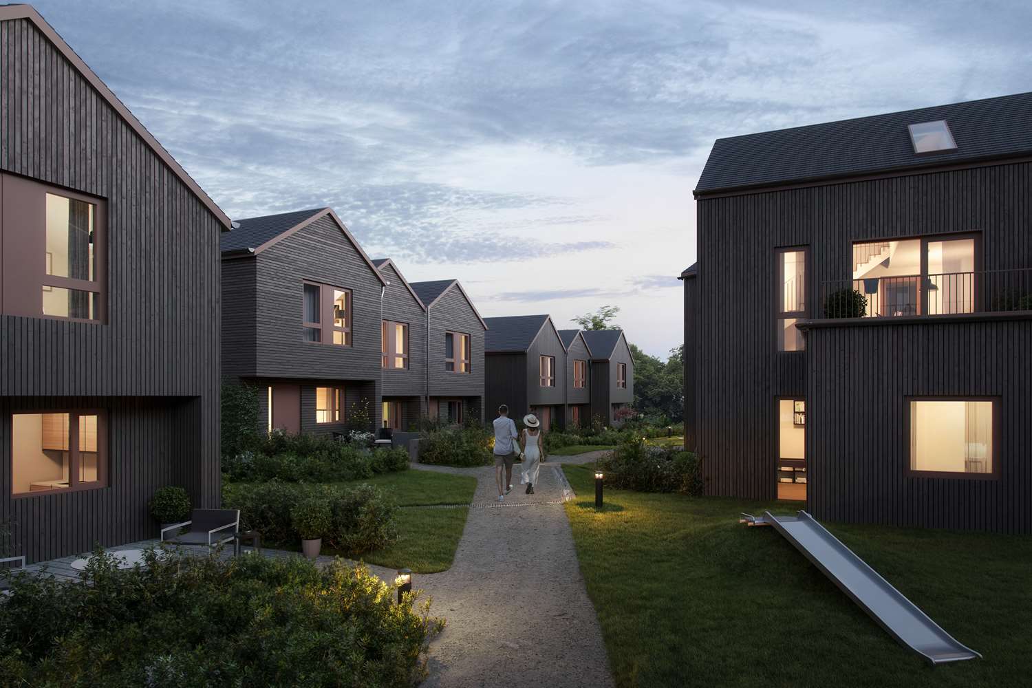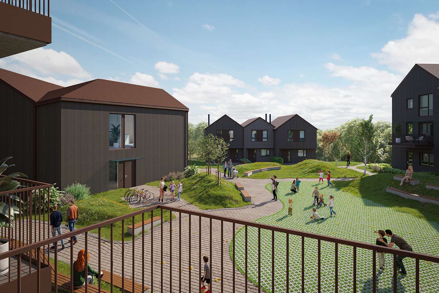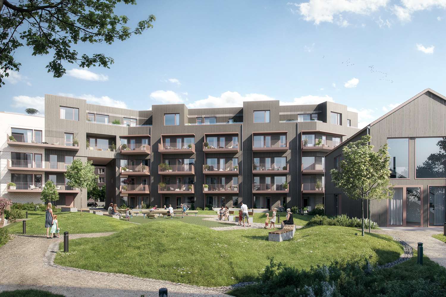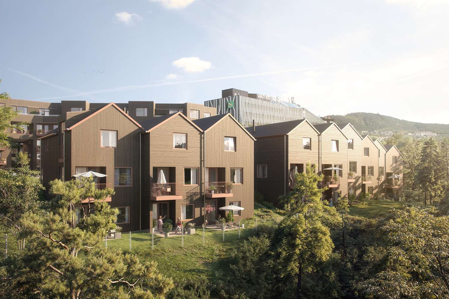 Her bygger vi 12 rekkehus og 46 leiligheter med balkong eller terrasse – alle med moderne planløsninger og gode lysforhold.